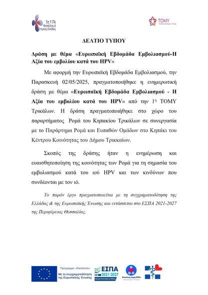 Δράση με θέμα «Ευρωπαϊκή Εβδομάδα Εμβολιασμού-Η Αξία του εμβολίου κατά του HPV»